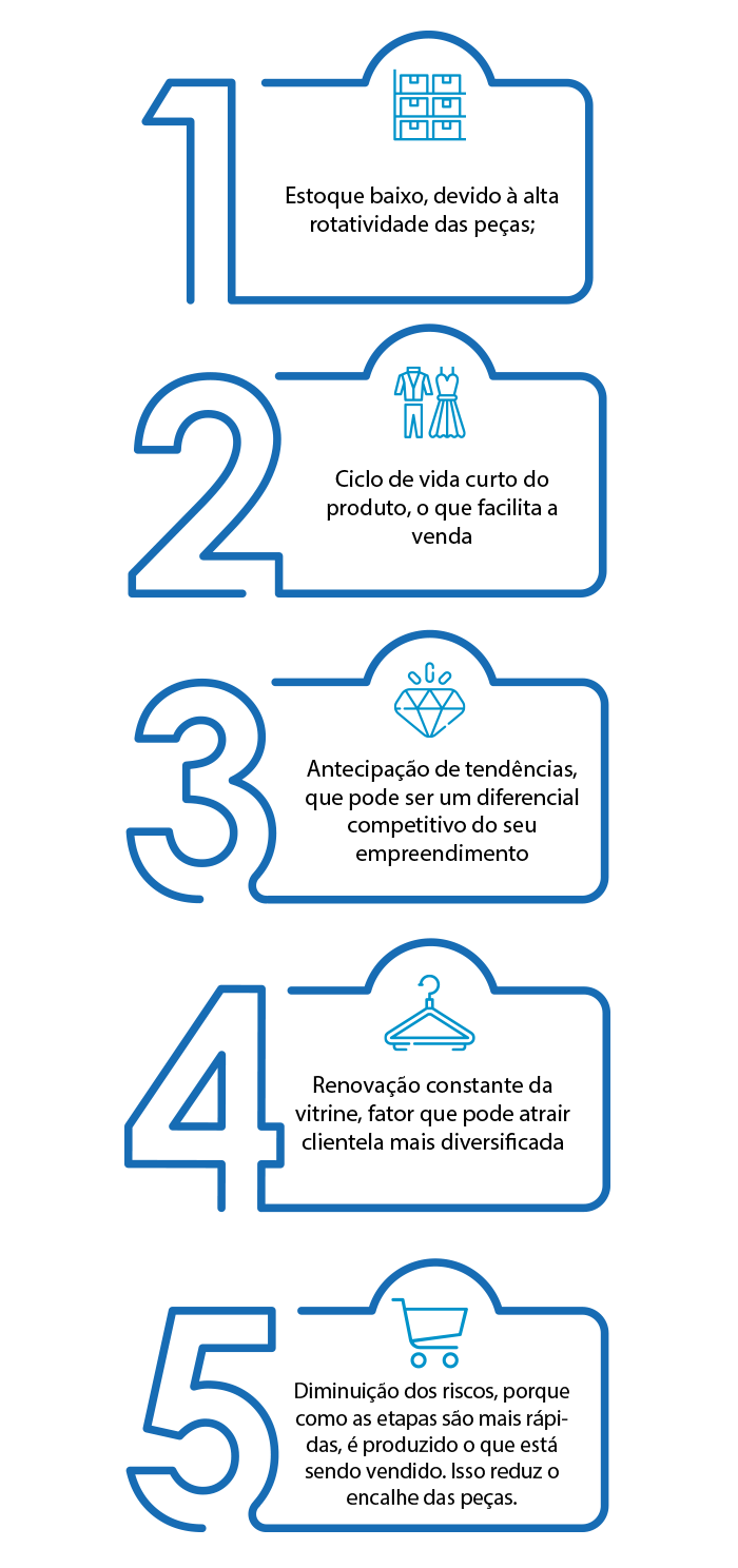 Os produtos têm vida curta e os estoques são baixos na cadeia do fast fashion. Além disso, não se perde tempo fabricando o que não está sendo vendido. De olho nas tendências, quem investe nesse modelo abre demanda de produção para as novas coleções que estão sendo pensadas e desenhadas.