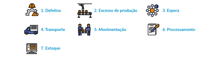 A mentalidade do Lean thinking identificou sete desperdícios da produção:
