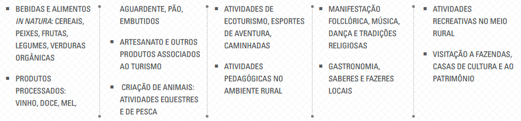 - Turismo rural: atividade relacionada à vida e aos frutos da produção agropecuária, de forma a resgatar e promover o patrimônio cultural da região e sua comunidade. No turismo rural, estão presentes as seguintes características: