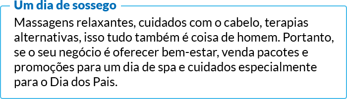 Aqui vale também fazer parcerias com outros empreendimentos, como lojas de cosméticos e cervejarias. E como o Dia dos Pais tem uma energia familiar, ofereça pacotes para que os filhos e filhas também participem desse dia especial junto com eles.