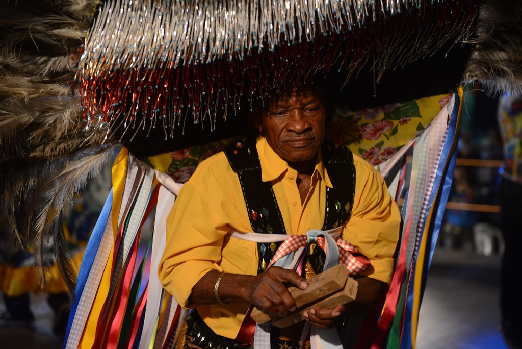 O Bumba Meu Boi é um das folguedos mais conhecidos do MA. Na foto, um caboclo de fita toca matracas, um dos instrumentos musicais típicos do perído