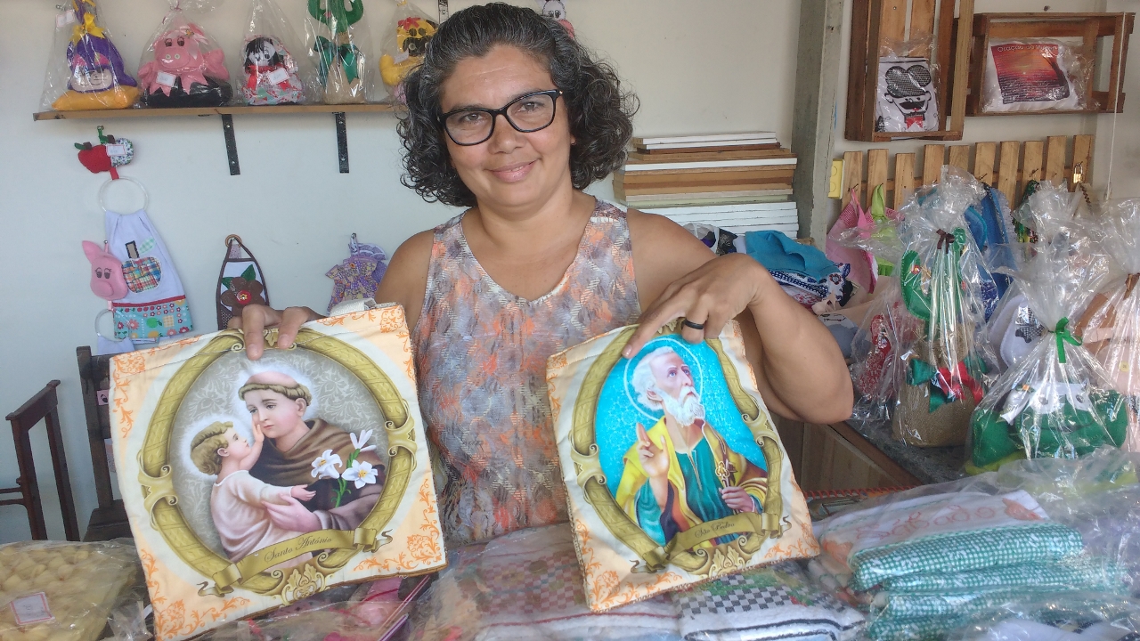 A artesã Gracioneth Reinaldo Costa espera vender mais com a produção de artigos de inspiradas em Santo Antônio (esq), São Pedro (dir) e outros santos homenageado em junho