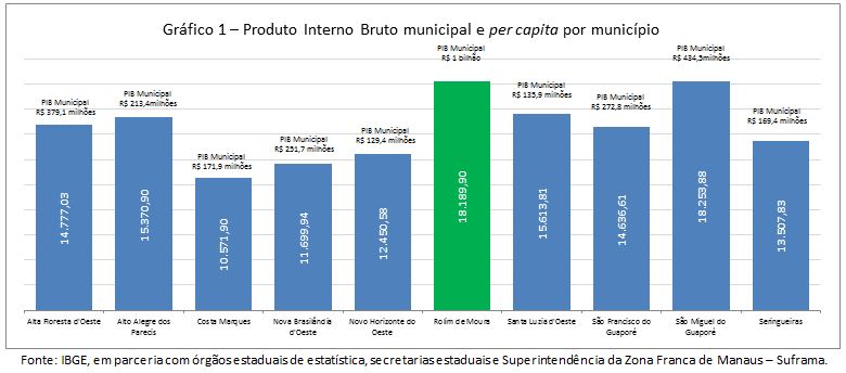O município de Rolim de Moura possuía em 2014 um Produto Interno Bruto (PIB) no valor de R$ 1.015.124,00, com um PIB per capita de R$ 18.189,90 (Gráfico 1). O Índice de Desenvolvimento Humano do município registrado em 2013 foi de 0,7 (Gráfico 2). O rendimento médio por pessoa do estado, calculado em 2010, foi de R$ 1.058,97 (Gráfico 3). A arrecadação total de impostos do município em 2015 foi de R$ 108,4 milhões, sendo pouco mais de R$ 22,5 milhões de Imposto sobre Circulação de Mercadorias e Serviços (ICMS) e R$ 4,4 milhões de Imposto Sobre Serviços (ISS) (Gráfico 4).