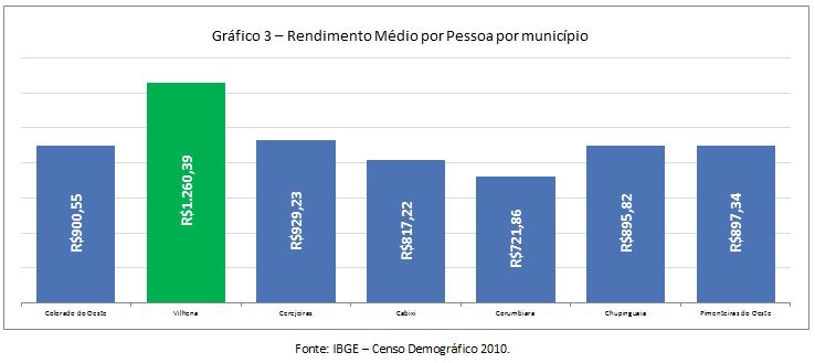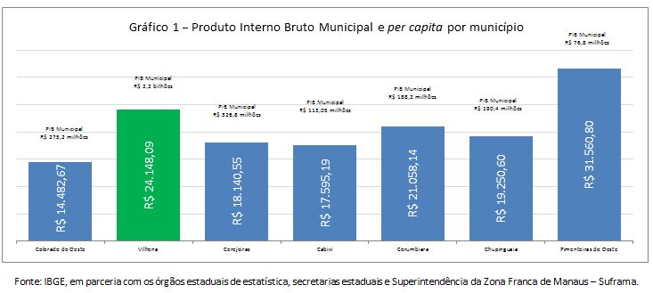 O município de Vilhena possuía em 2013 um Produto Interno Bruto (PIB) no valor de R$ 2.168.426.000,00, com um PIB per capita no valor de R$ 24.148,09 (Gráfico 1). O Índice de Desenvolvimento Humano daquele município registrado em 2013 foi de 0,731 (Gráfico 2). O rendimento médio em 2010 por pessoa do estado foi de R$ 1.260,39 (Gráfico 3). A arrecadação total de impostos do município em 2013 foi pouco mais de R$ 197,6 milhões, sendo cerca de R$ 38,2 milhões de Imposto sobre Circulação de Mercadorias e Serviços (ICMS) e R$ 10,9 milhões de Imposto Sobre Serviço (ISS) (Gráfico 4).