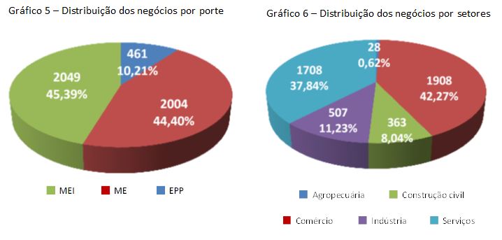 De acordo com o Cadastro Sebrae de Empresas (CSE), em 2015 havia em Vilhena 4.514 pequenos negócios formalizados (com Cadastro Nacional de Pessoas Jurídicas – CNPJ ativo), dos quais 10,21% eram empresas de pequeno porte (EPP), 44,4% eram microempresas e 45,39% eram microempreendedores individuais (Gráfico 5 e Tabela 2). Quanto ao setor econômico, quase 0,6% pertencia ao agronegócio, pouco mais de 8% pertenciam à construção civil, praticamente 11% eram indústrias, quase 38% eram de serviços e pouco mais de 42% eram do comércio (Gráfico 6 e Tabela 2).