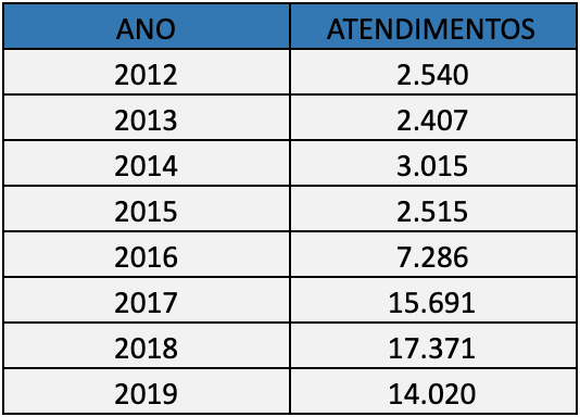 Na tabela abaixo, é possível verificar a quantidade de atendimentos por ano: