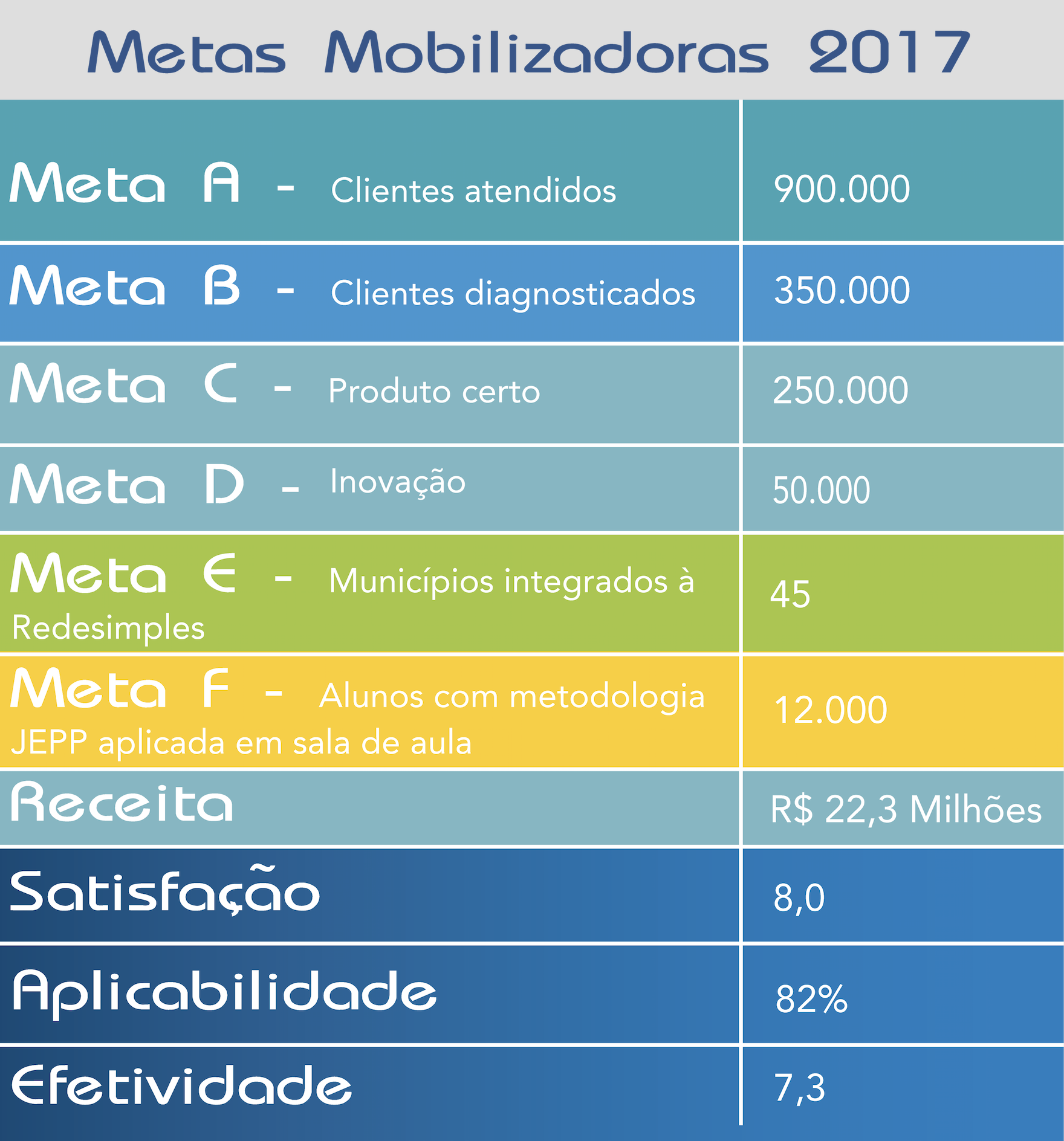 As metas mobilizadoras têm por finalidade especificar, quantificar, indicar o foco, as áreas e projetos prioritários que todos os colaboradores, dirigentes e parceiros do Sistema Sebrae devem concentrar seus esforços para atingir os Objetivos Estratégicos.