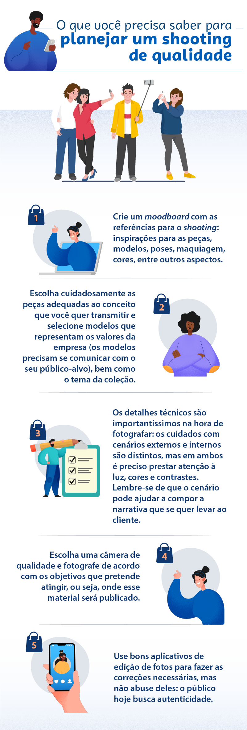 Quem é do segmento de moda, com certeza, já se deparou com editoriais maravilhosos e fotos super produzidas em jornais, revistas, blogs e sites. Mas você já parou para pensar em quantas pessoas estão envolvidas nesse processo até chegar ao resultado final? Modelos, fotógrafos, influenciadores, diretores de marketing e profissionais de criação, produção e seleção das peças participam do chamado shooting de moda, ou seja, um dia dedicado a fotografar ou filmar o que deve chegar até o público-alvo. Porém, para comunicar visualmente o que a marca pretende, não basta qualquer fotografia, não é mesmo?