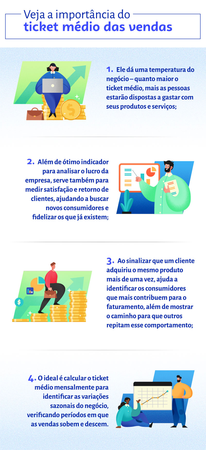 É por isso que a implantação de métricas como a do ticket médio se torna fundamental para aferir os resultados das vendas. Para entender, basta ter em mente que, enquanto algumas pessoas gastam muito em uma única compra, outras preferem investir pouco.