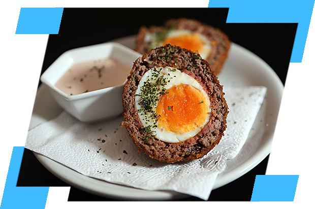 Muito apreciado nos pubs de Londres, o scotch egg (ovo à escocesa) é um ovo cozido, coberto por carne moída (que pode ser de porco ou de vaca), empanado em farinha de rosca e, depois, frito em gordura.