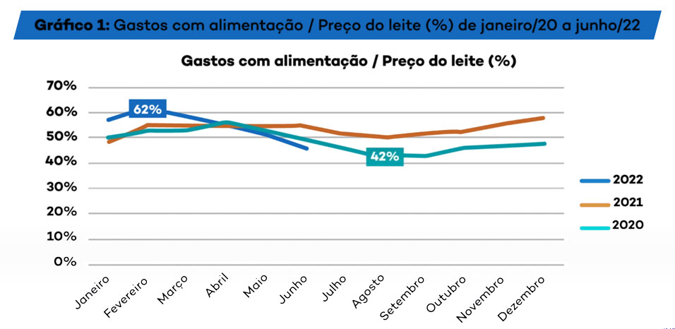 Em geral, mesmo com o preço do leite acima do normal no segundo trimestre de 2022, a relação entre o preço do leite e os gastos com alimentação do rebanho não foi diferente quando comparada aos anos anteriores, uma vez que os custos alimentares também estiveram acima do normal.