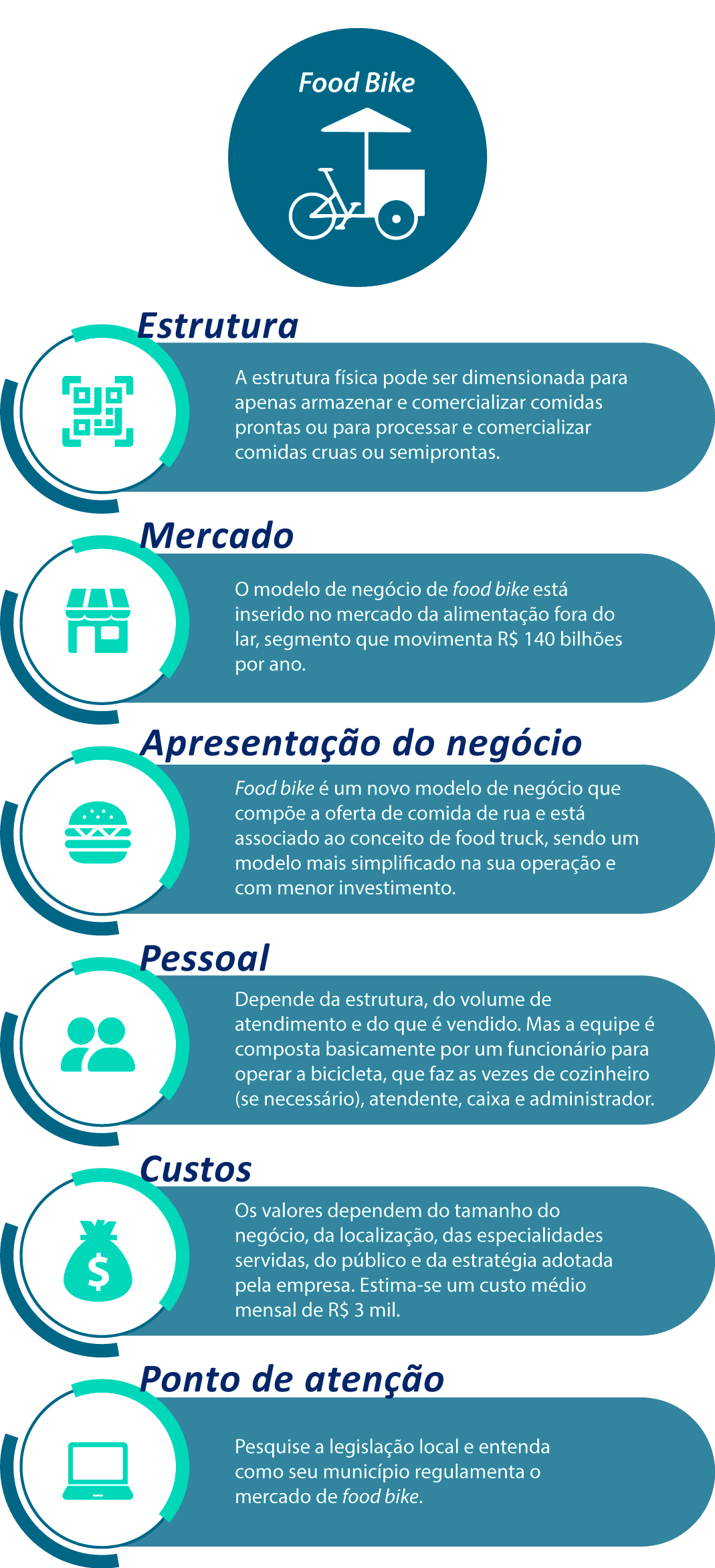 Food bike é um novo modelo de negócio. Ele compõe a oferta de comida de rua e está associado ao conceito de food truck, sendo mais simplificado na sua operação e com menor investimento.