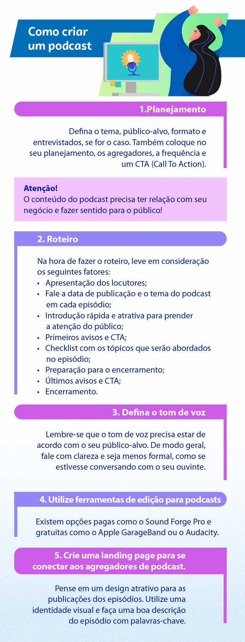 Assim, muitas empresas já perceberam o potencial dos podcasts e têm investido nesse canal para gerar conexão com o cliente. Com uma linguagem direta e menos formal, o podcast pode aproximar o negócio do público, criar um vínculo e gerar engajamento.