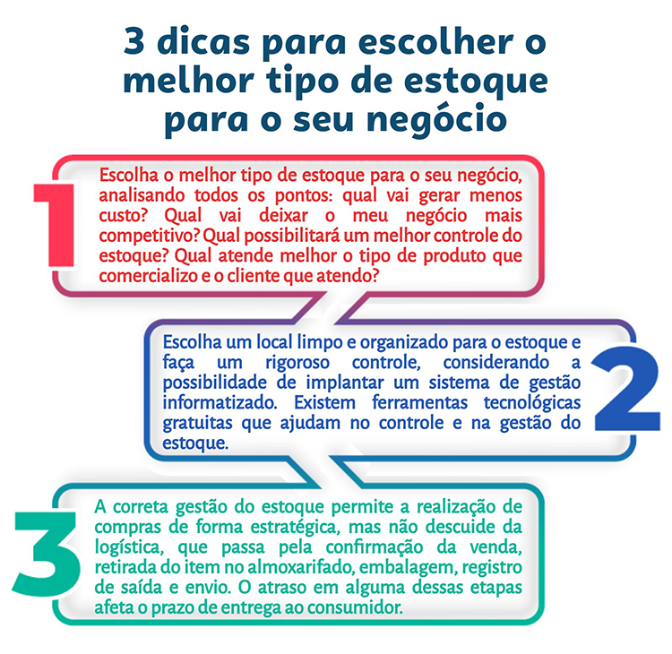Antes de tomar uma decisão, analise as vantagens e desvantagens de cada uma dessas modalidades de estoque, levando em consideração também o tipo de empresa que você tem e, principalmente, quanto você tem para investir inicialmente. Acompanhe também no infográfico as dicas para escolher o melhor tipo de estoque para o seu negócio. Se ainda tiver dúvidas, entre em contato com o Sebrae pelo 0800 570 0800.