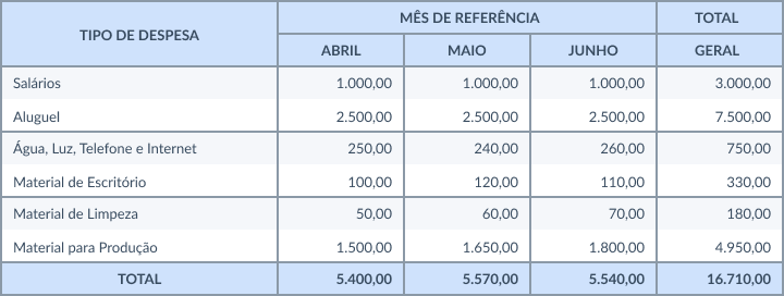 Primeiramente, faça um levantamento das despesas previstas para os próximos três meses, separando os valores de acordo com o tipo de despesa. Veja o quadro exemplificativo abaixo:
