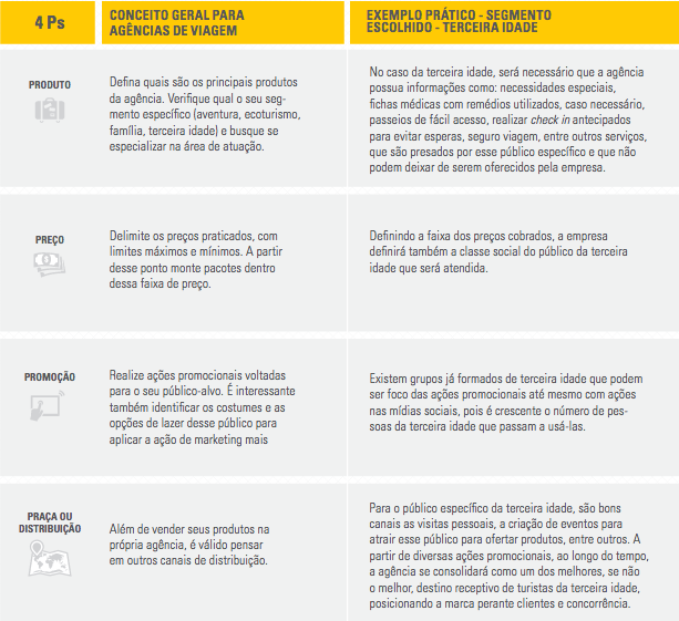 Para mostrar na prática como se inova em uma agência de turismo receptivo, apresentamos um modelo de planejamento de baseado nos 4 Ps de marketing para uma empresa que optou pelo segmento “turismo de terceira idade” e tem por objetivo definir como a marca será percebida pelos clientes, ou seja, qual será o diferencial da empresa.