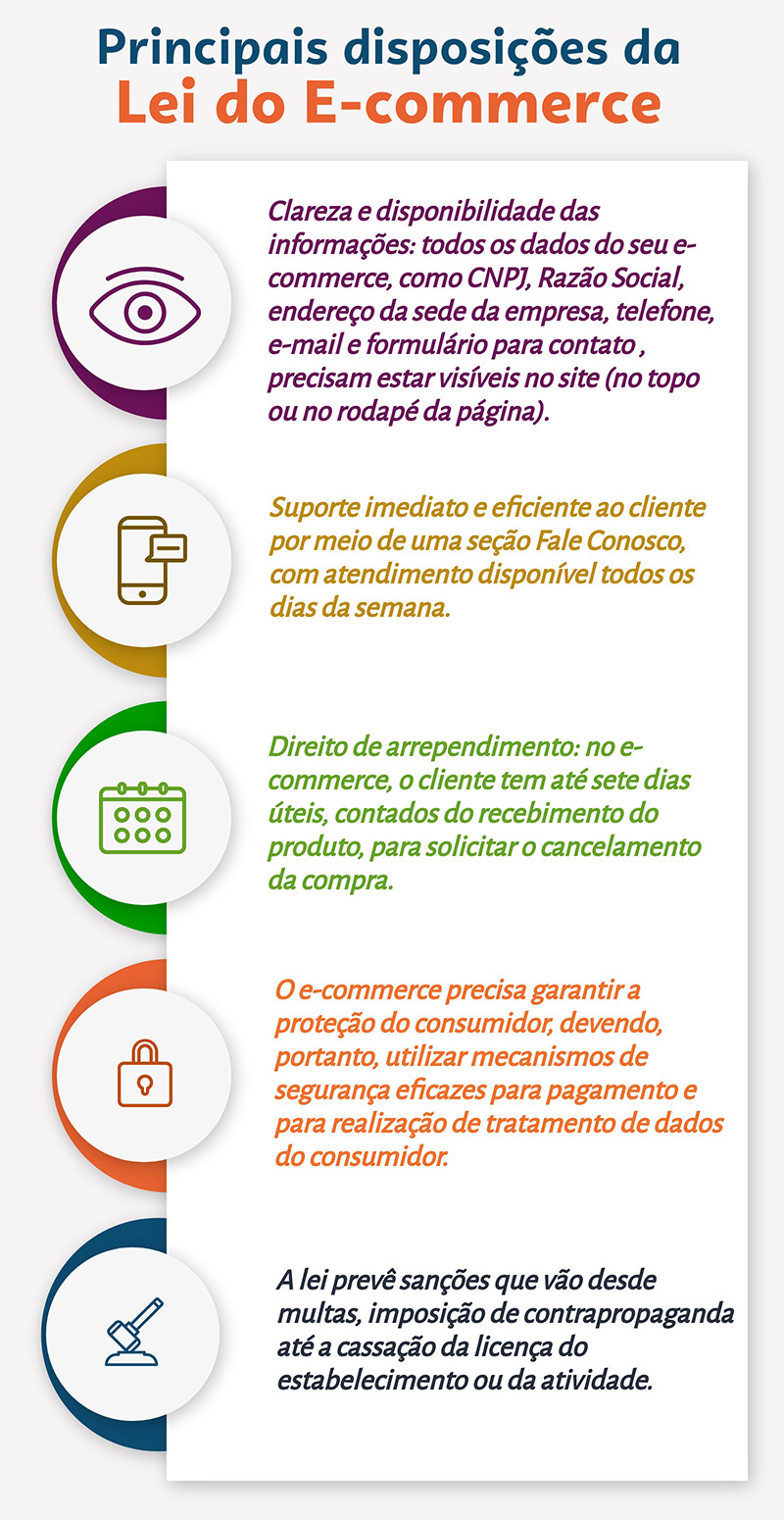 Transparência, atendimento facilitado e respeito ao direito de arrependimento do cliente são as diretrizes principais da Lei do E-commerce (Lei 7.962/2013), a qual é uma complementação do Código de Defesa do Consumidor. A intenção foi regulamentar o comércio eletrônico, que tem regras diferentes das lojas físicas.