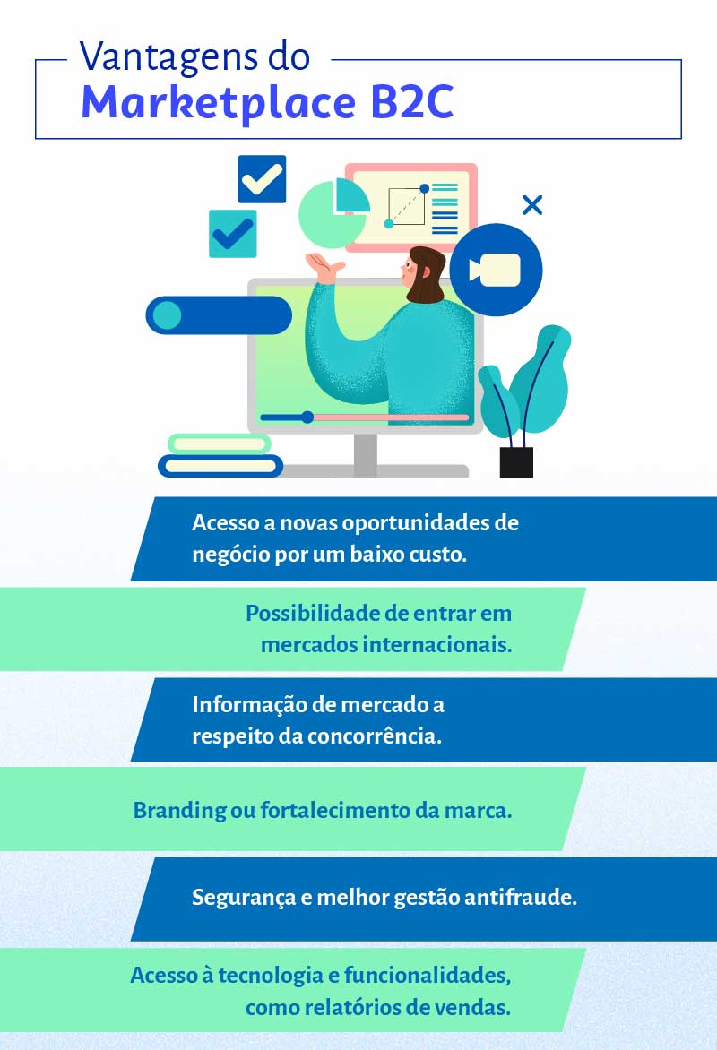 Para os vendedores, as vantagens dos marketplaces B2C são: processo de venda simplificado, mercado amplo e grande frequência de aquisição. Para as pequenas empresas é importante ressaltar que é uma oportunidade de conquistar mais clientes, de ganhar visibilidade e aumentar o alcance.