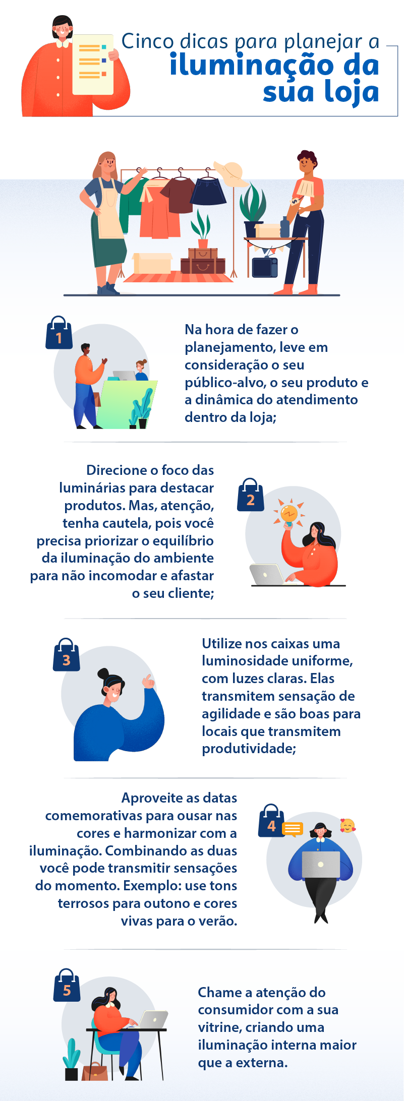 É importante que o projeto de iluminação seja específico para cada setor, com lâmpadas direcionadas e estratégias de disposição. Por exemplo, as luminárias de um trocador de roupas não devem ser as mesmas lâmpadas do caixa. Porque os objetivos de cada setor são diferentes.