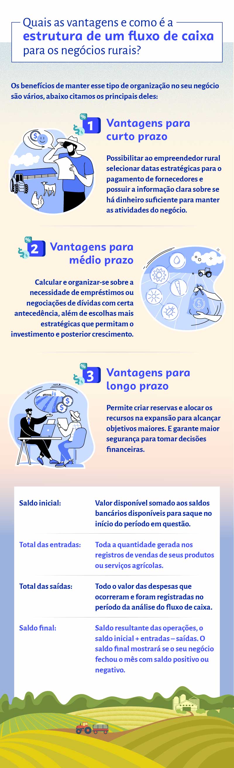 Portanto, o fluxo de caixa é a ferramenta que ajuda o produtor rural a controlar as entradas e saídas de dinheiro do seu negócio, dados importantes o suficiente para o caminho entre decisões corretas e cada vez mais estratégicas.