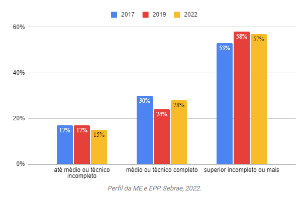 Em termos de escolaridade, mais da metade dos microempresários (57%) chegaram ao nível superior. Esse resultado indica que esse público tem uma escolaridade acima da média brasileira (17%) e acima do observado entre os MEI.