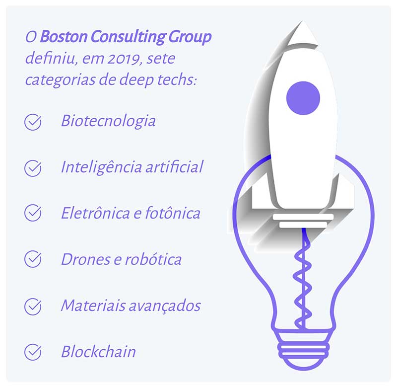 Deep techs são startups baseadas em investigação científica apoiada por patentes, que atuam com inovação complexa, lidando com problemas como o tratamento de doenças, mobilidades, aquecimento global e desenvolvimento industrial.