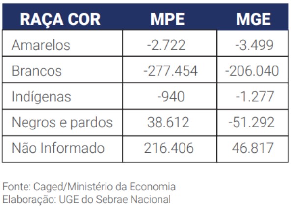 Os empregados da cor branca foram a maioria dos demitidos pelas MPEs e MGEs, entre os meses de janeiro e outubro de 2020. Em decorrência dos saldos de geração de emprego das MPEs e das MGEs estarem negativos, todos os outros grupos, independentemente do porte da empresa, também apresentam saldos negativos, com exceção do grupo dos empregados negros (pretos e pardos) nas MPEs, que apresentou saldo positivo de 38.612 empregos gerados em 2020.