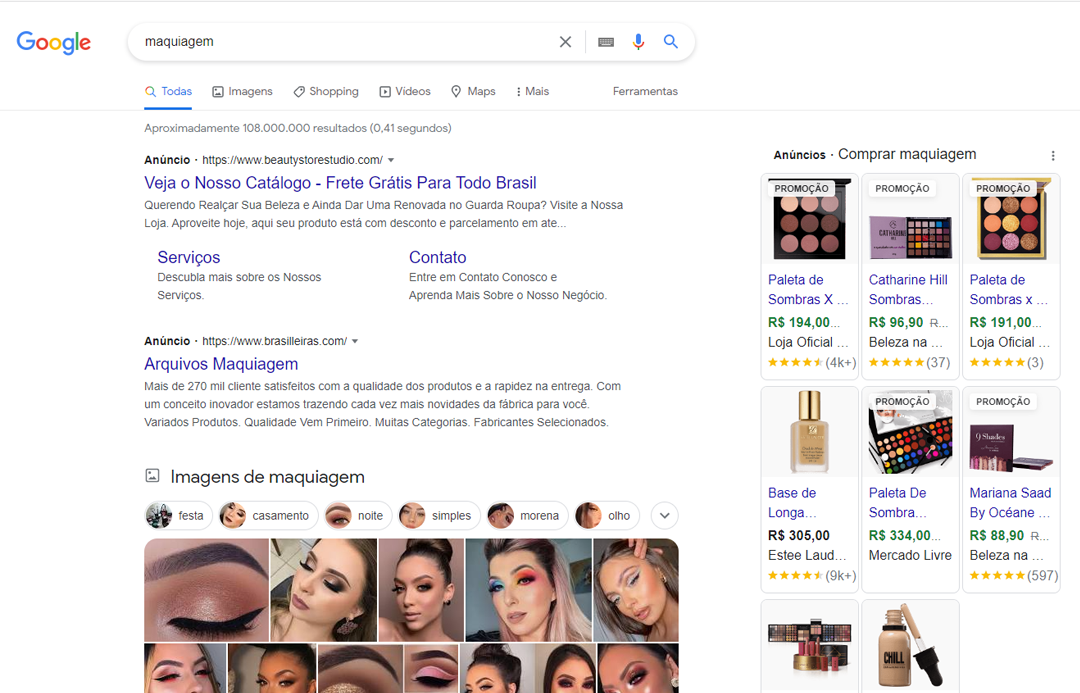 Em uma busca rápida usando a palavra-chave “maquiagem”, por exemplo, o Google oferece como resposta nada menos do que aproximadamente 95 milhões de resultados, divididos em milhares de páginas - daí a importância de o seu negócio aparecer logo no início.