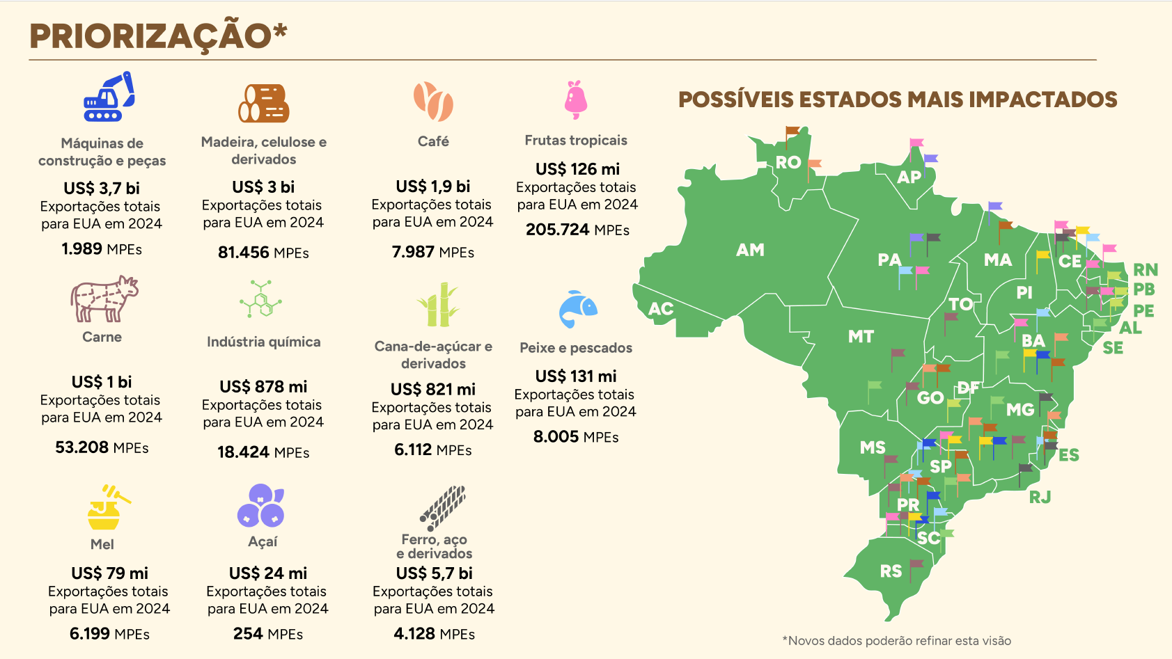 Além disso, preparamos medidas que buscam garantir apoio técnico aos empresários, que vão desde consultorias, orientação para acesso ao crédito e oportunidades de novos mercados, com o objetivo de que essas empresas sobrevivam às consequências dessa taxação e fortaleçam sua participação em políticas de desenvolvimento econômico de longo prazo. Os pontos de atendimento regionais do Sebrae estão atuando prontamente com os empresários impactados.