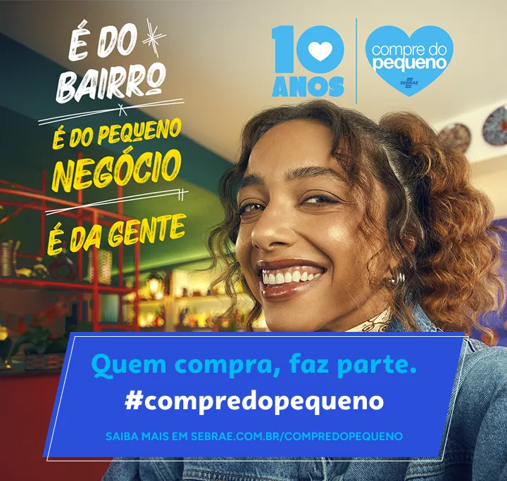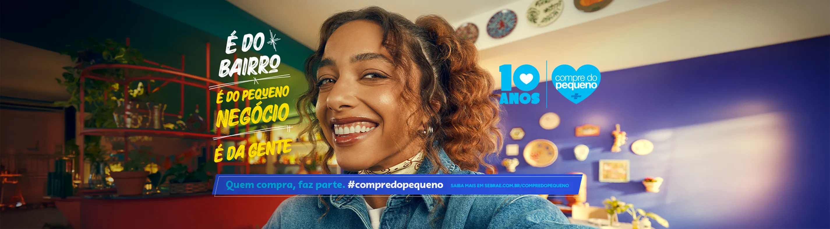 Os pequenos negócios estão por toda a parte, ajudando no desenvolvimento da sua região. Quando você compra do pequeno, fortalece a economia local e contribui diretamente com a sua qualidade de vida (e com a de quem mora perto de você). Ao comprar dos pequenos negócios, você ajuda a oferecer o primeiro emprego para muitas pessoas, distribuir melhor a renda e dinamizar a economia, gerando riqueza e desenvolvimento. Há 10 anos o Sebrae apoia esse movimento que está no dia a dia de todos. Afinal, comprar do pequeno é da gente.