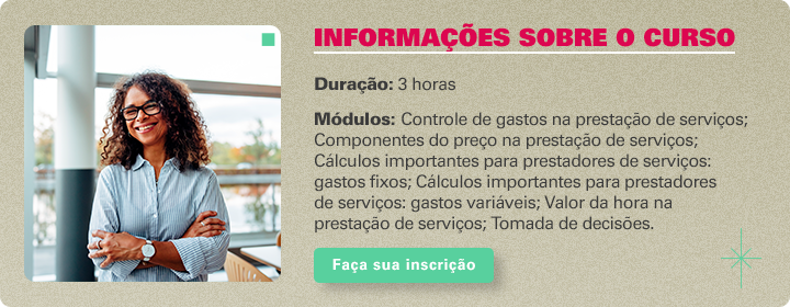 Neste curso, você aprenderá a identificar e controlar os custos e despesas dos seus serviços, além de encontrar o ponto de equilíbrio de seus preços e tomar decisões estratégicas sobre a redução de gastos e a ampliação da margem de lucro do seu empreendimento.