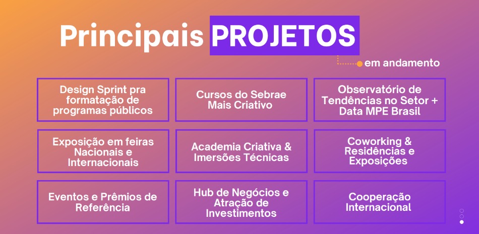 - Políticas Públicas: Criação de um ambiente de negócios favorável e suporte na implementação de políticas públicas para negócios criativos.