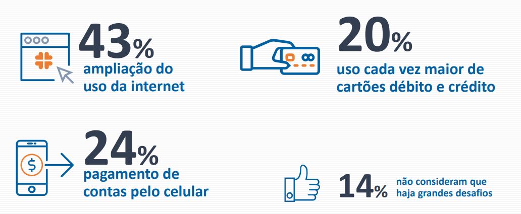 Conforme mostra a figura a seguir, enquanto 43% dos entrevistados veem a ampliação do uso da internet como um dos principais desafios apresentados, 14% não consideram que haja grandes desafios pela frente.
