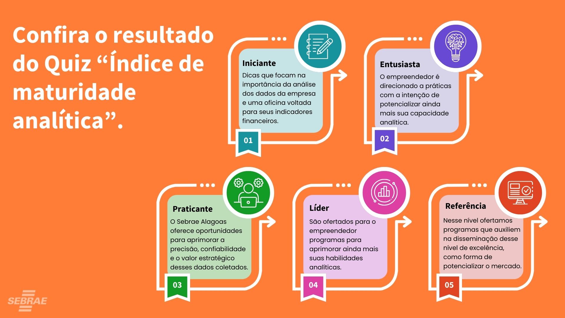 Em 2024, o Sebrae Alagoas lançou uma proposta pioneira, entre todas as unidades do Sebrae pelo Brasil, que está sendo considerada para implementação em outros estados. A iniciativa oferece o Quiz de “Índice de Maturidade Analítica”, onde o empresário fará uma autoanálise sobre o seu nível atual de maturidade analítica. Com base no resultado, são apresentadas soluções para o desenvolvimento de um plano de ação que seja focado na melhoria do negócio.