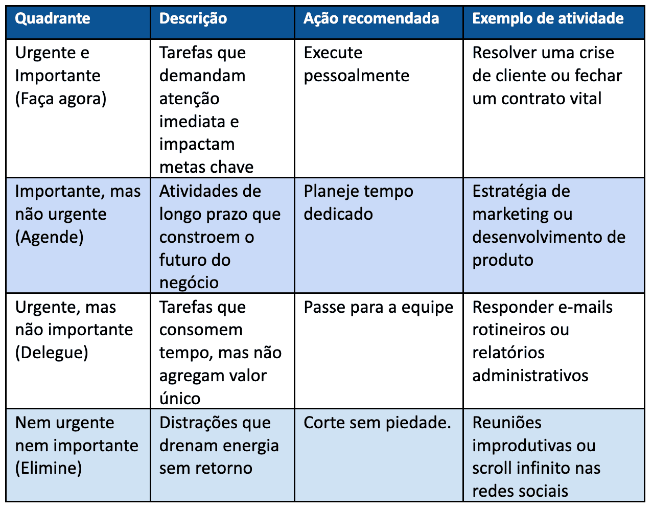 Use ferramentas e estratégias como a Matriz Eisenhower, a automação e a delegação eficaz, para ajudar você a equilibrar responsabilidades e escalar seu negócio sem sacrificar a sanidade.