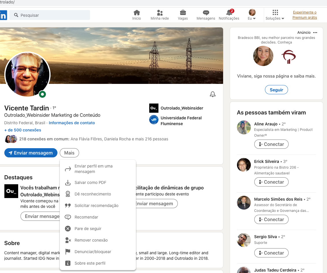 7- Faça recomendações e também peça recomendações. Vá no perfil de outras pessoas, aperte "Mais" e depois “Solicitar recomendação” e “Recomendar”. Lembre-se de fazer os dois.
