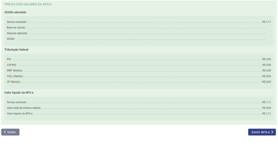 Na tela a seguir você irá conferir os dados da nota fiscal, caso estejam corretas todas as informações é só concluir o processo de emissão clicando em emitir NFS-e.