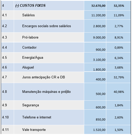No exemplo acima podemos identificar três custos variáveis CMV, Simples Nacional e Taxa de administração de cartões.