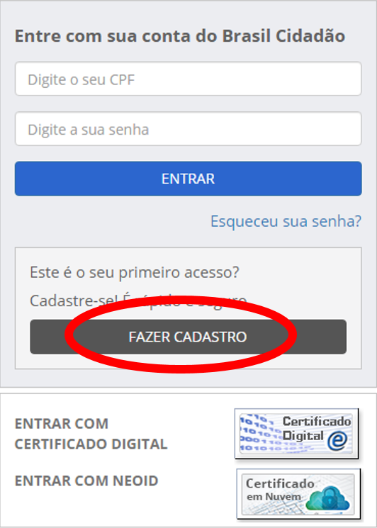 Clique na opção “Fazer Cadastro” tenha em mãos um documento de identidade, número do CPF, nome completo, e-mail e número do celular.