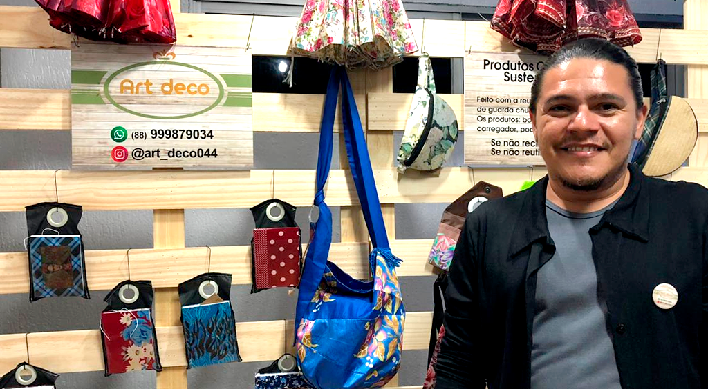 Daniel Fernandes, da Art Deco, viu no reaproveitamento de tecidos de guarda-chuvas uma oportunidade de negócio criativo e passou a produzir cadernos, bolsas e demais acessórios. O cuidado com o meio ambiente não fica apenas em seus produtos, mas também se estende aos detalhes do seu cotidiano. O stand da marca na Fenaiva 2019, por exemplo, conta com paletes e materiais auxiliares oriundos dos guarda-chuvas.