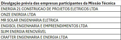 | Divulgação final das empresas selecionadas | 22 de abril de 2026 até meio dia |