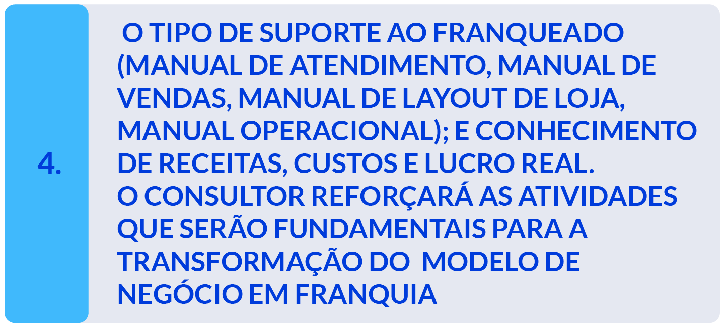 O consultor reforçará as atividades que serão fundamentais para a transformação do modelo de negócio em franquia.