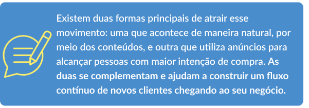 Existem duas formas principais de atrair esse movimento: uma que acontece de maneira natural, por meio dos conteúdos que você publica, e outra que utiliza anúncios para alcançar pessoas com maior intenção de compra. As duas se complementam e ajudam a construir um fluxo contínuo de novos clientes chegando ao seu negócio.