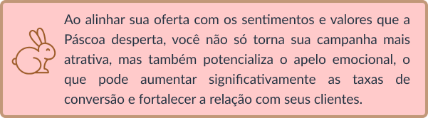 A Páscoa é um período de renovação, esperança e união, e esses significados podem ser poderosamente utilizados para criar ofertas que ressoem com seus clientes. Ao conectar esses valores ao seu produto ou serviço, sua comunicação se torna mais envolvente e persuasiva, estabelecendo uma ligação emocional com o público.