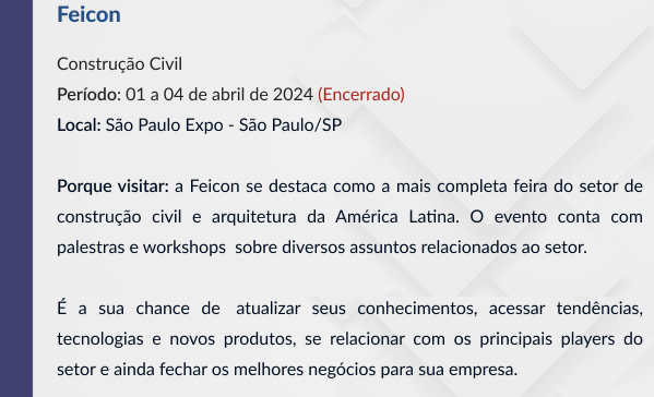 Além disto, você poderá ter a oportunidade de realizar visitas técnicas a empresas de destaque no mercado. Isso permitirá que você conheça de perto suas instalações, processos, produtos e serviços, para aprender e se inspirar com marcas de sucesso.