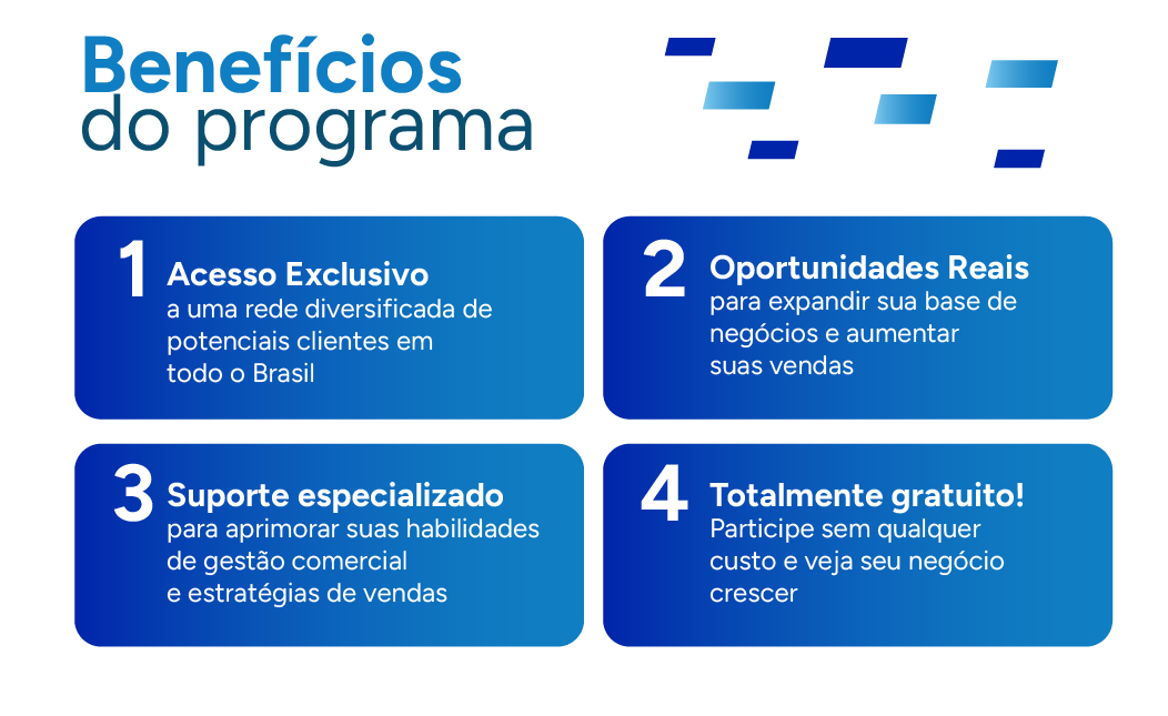 Conecte-se a compradores em todo o Brasil e prepare sua empresa para superar as barreiras comerciais através de ferramentas inovadoras e abordagens estratégicas de vendas.