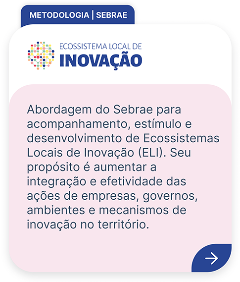 O Sebrae se posiciona nessa frente com sua abordagem ELI – Ecossistema Local de Inovação, que atua para aumentar a integração e efetividade entre os atores de um ecossistema, fomentando governanças locais de inovação capazes de tracionar todo o processo de fortalecimento de um ELI.