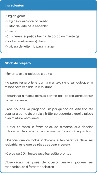 Não existia farinha de trigo no Estado, mas tinha muita goma/polvilho, sem esquecer, que por ter grandes fazendas que tinham um grande excedente de queijos. Daí saiu a combinação simples de goma, ovos, leite, queijo e sal.
