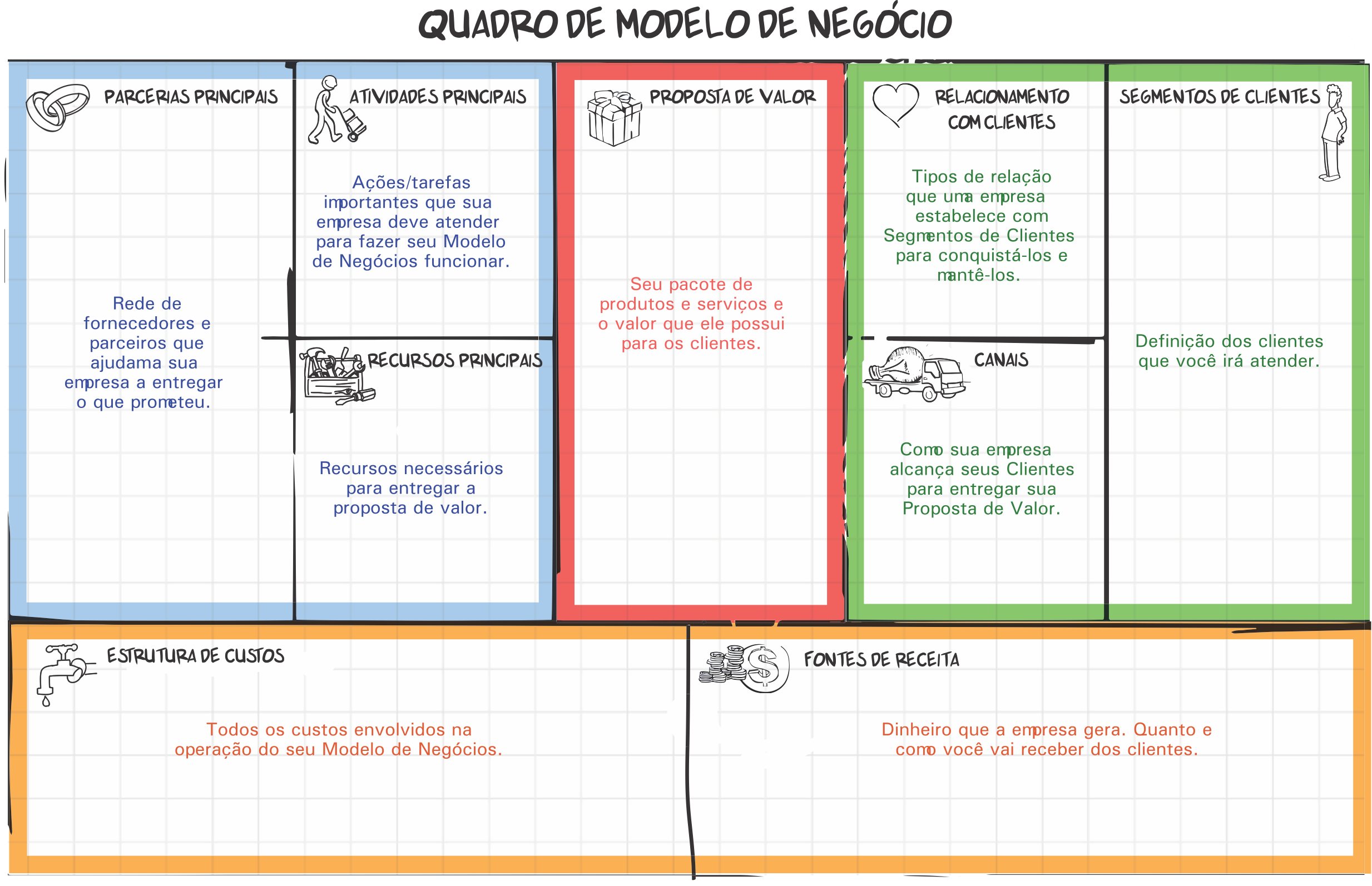 Com auxílio do consultor especialista o empresário terá a oportunidade de desenhar um mapa estratégico contendo 9 blocos que irão redefinir a forma de atuar da sua empresa. Os blocos são: