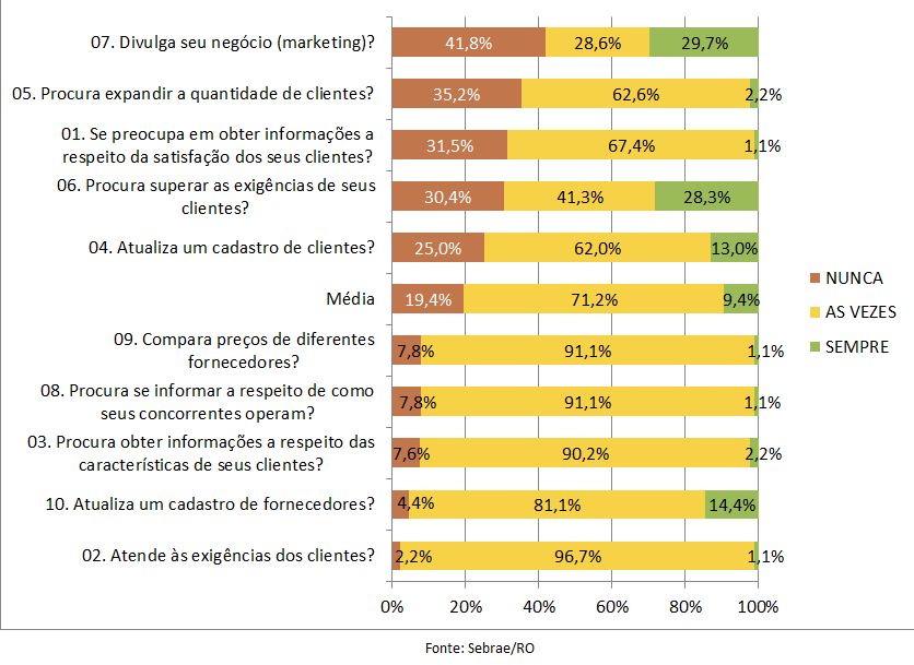 A análise dos diagnósticos aplicados entre março e novembro de 2016 em 200 pequenos negócios de Ji-Paraná revelou que nos MEI o percentual médio de respostas “nunca” para as perguntas da área Operação foi 41,7% do total de respostas, da área de Finanças foi 38%, e da área de Mercado foi 24,9%, indicando que as práticas gerenciais nas áreas de Operação e Finanças são mais negligenciadas pelas empresas desse porte. Nas microempresas o diagnóstico revelou que em Ji-Paraná o percentual de respostas “nunca” para as perguntas da área de Operação foi de 24,6%, enquanto que da área de Finanças foi 20,8%, e da área de Mercado, 19,4%.